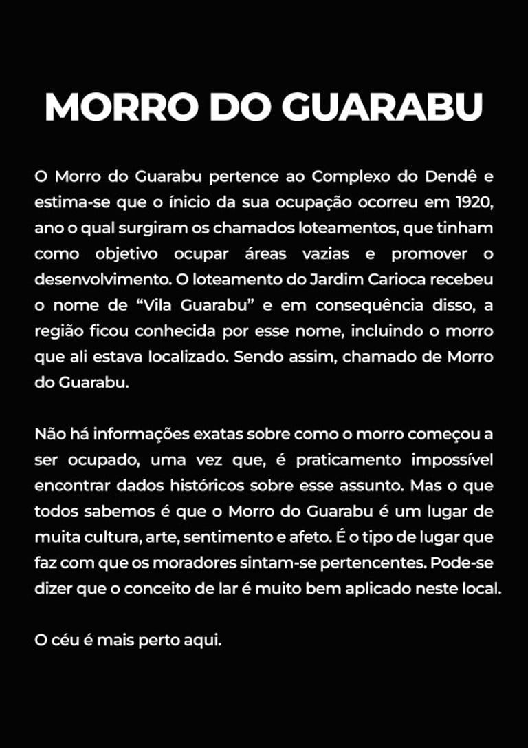 Exposição de arte e fotografia sobre o Morro do Guarabu, comunidade localizada na zona norte do Rio de Janeiro. Onde sou cria.