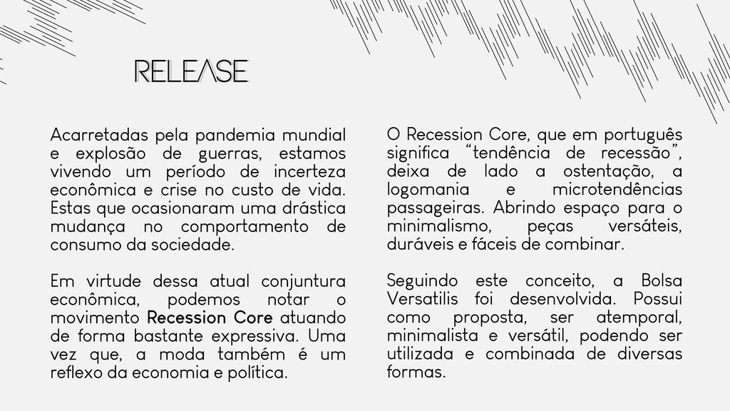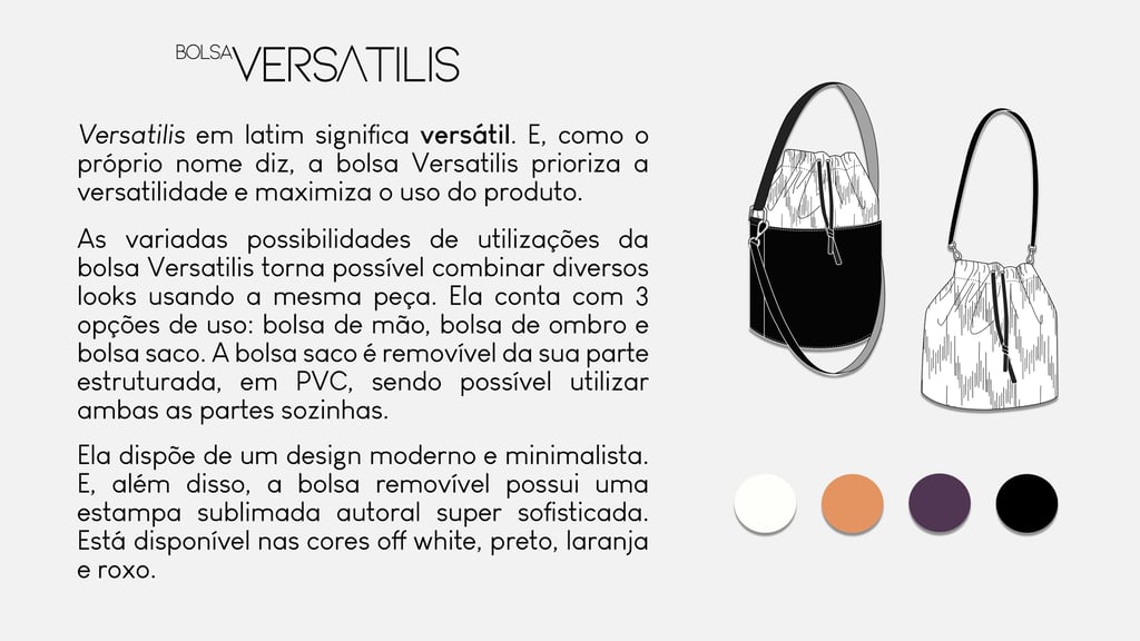 Acessório desenvolvido para o Inverno 24, possui como referência o movimento Recession Core, uma macrotendência que prioriza produtos versáteis, duráveis, discretos e atemporais. Exatamente tudo que a Bolsa Versatilis proporciona. Ela possui 3 opções de uso, possui estampa autoral e dispõe de um design moderno e minimalista. Nas 4 variantes de cores: preto, off white, laranja e roxo. Versatilis em latim significa versátil, a descrição perfeita para esse produto!
